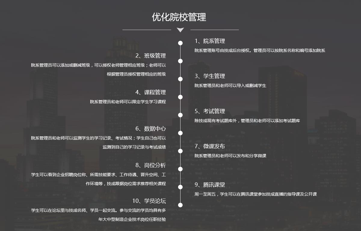 老师管理账号由技成按院系要求生成,技成后台授权可以监测到院系(管理员)授权管理所在班级、学生的课程学习及考试情况。